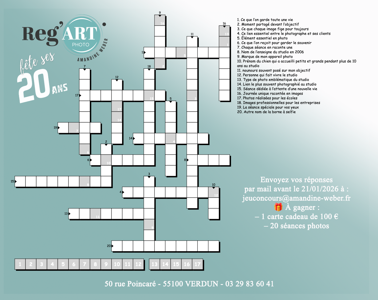 Pour fêter les 20 ans du studio et remercier mes clients, je vous propose de participer à un p’tit mot croisé anniversaire🎂